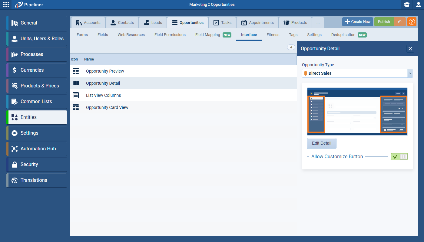 A new toggle button has been added to Entity Type › Interface › Detail settings which enables Admins to prevent users from customizing their record detail layout, ensuring a consistent interface. The option is ON by default (individual users can customise their own Detail layout); when switched OFF, the “Customize” button in the record detail sidebar becomes invisible to all users. ⤵