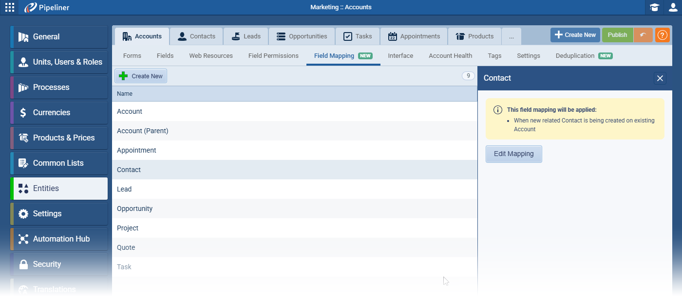 - create new fields with titles, descriptions, and values including new fields that are related to fields in Pipeliner Entities (existing radio groups or multi-select fields, for example) for better mapping