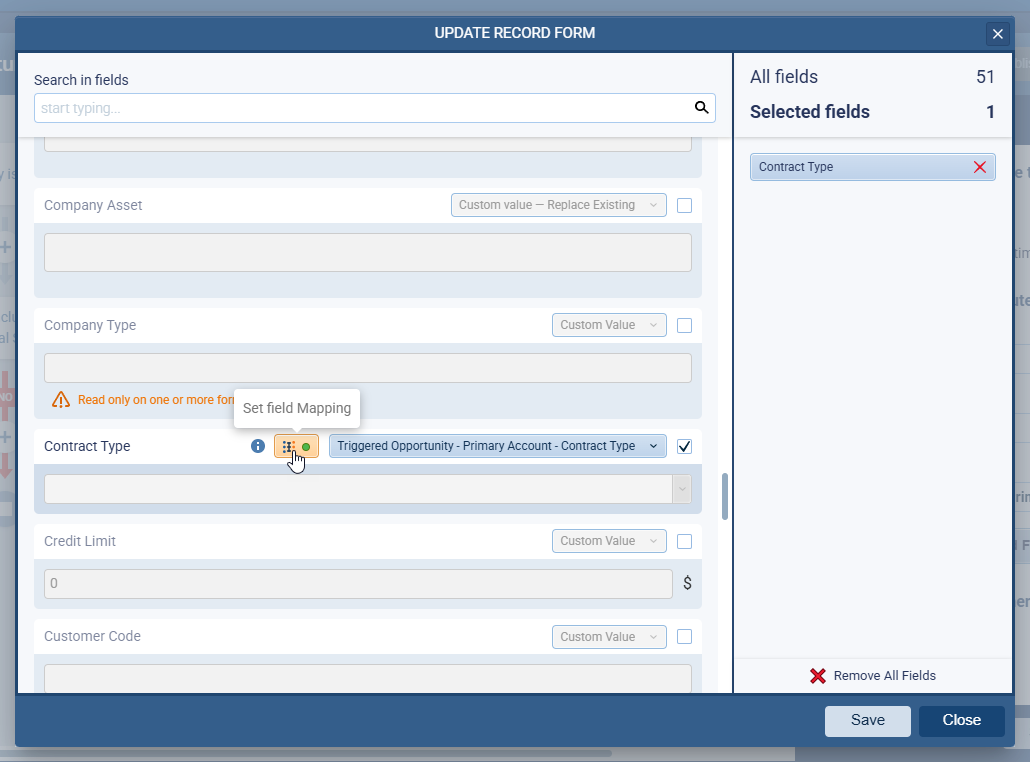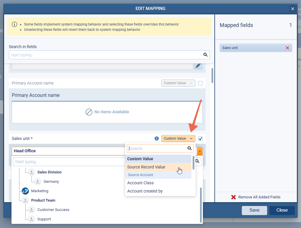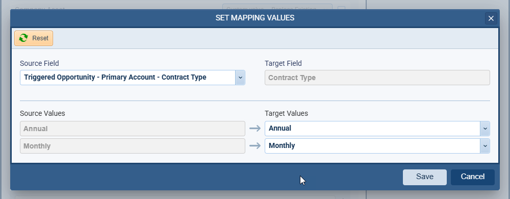 If a user selects a compatible field, the system automatically maps similar values between the two fields and this is indicated by a green icon on the mapping settings button. The user can open mapping settings dialog and review the mapped values. Any one source value can be mapped to one or more target values or can be omitted (mapped to “None“).