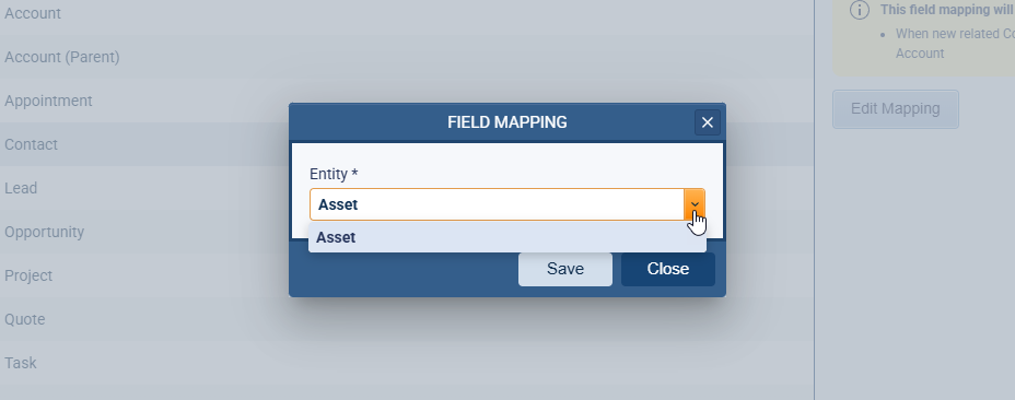 Once enabled, the Field Mapping Add-on will be available as a new sub-tab for all entities in Admin, except “ProductProduct Product refers to anything (an idea, item, service, process or information) that meets a need or a desire and is offered to a market, usually but not always at a price.” and “Product Line Items“. All system hardcoded mappings will be available for the Admin to change. System mappings cannot be deleted but can be modified or reset back to the system default behaviour. These system mappings are noted on the form and can be reset to the default behaviour by unticking the checkbox to disable the custom mapping.