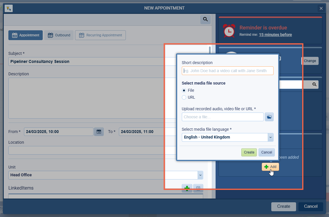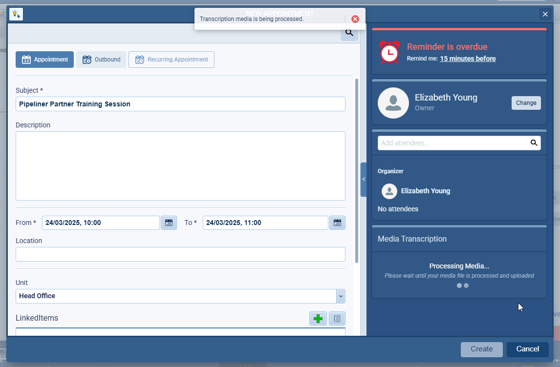 Voyager AI Media Transcription now brings the ease and efficiency of working with our “Call Recording” feature to Appointments. Users can upload a recording of a meeting to an Appointment in Pipeliner by adding the URL of the recorded meeting or by uploading an MP4 file. The Media Transcription will then process the video/audio and will create a transcription and summarization which the userUser User means a person who uses or consumes a product or a service, usually a digital device or an online service. can then copy to a field (e.g. Appointment Description) as required. This feature requires the purchase of credits which is managed from the “Communication” tab within the “CustomerCustomer Customer is an individual or an organization that purchases a product or signs up for a service offered by a business. Portal“.
