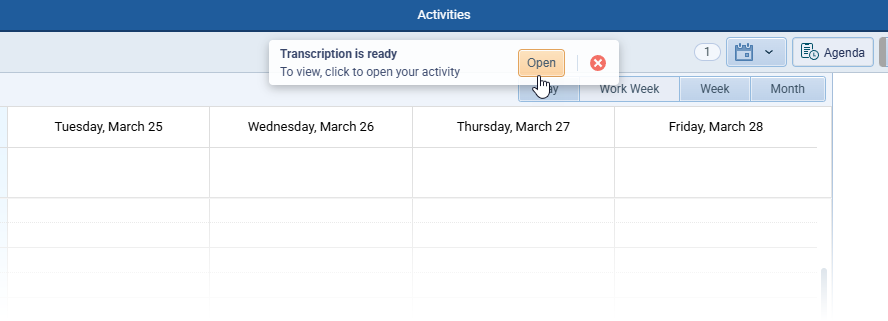 Once enabled in the Voyager AI configuration in the “Automation Hub“, the “Media Transcription” widget will display in all activities except Calls.