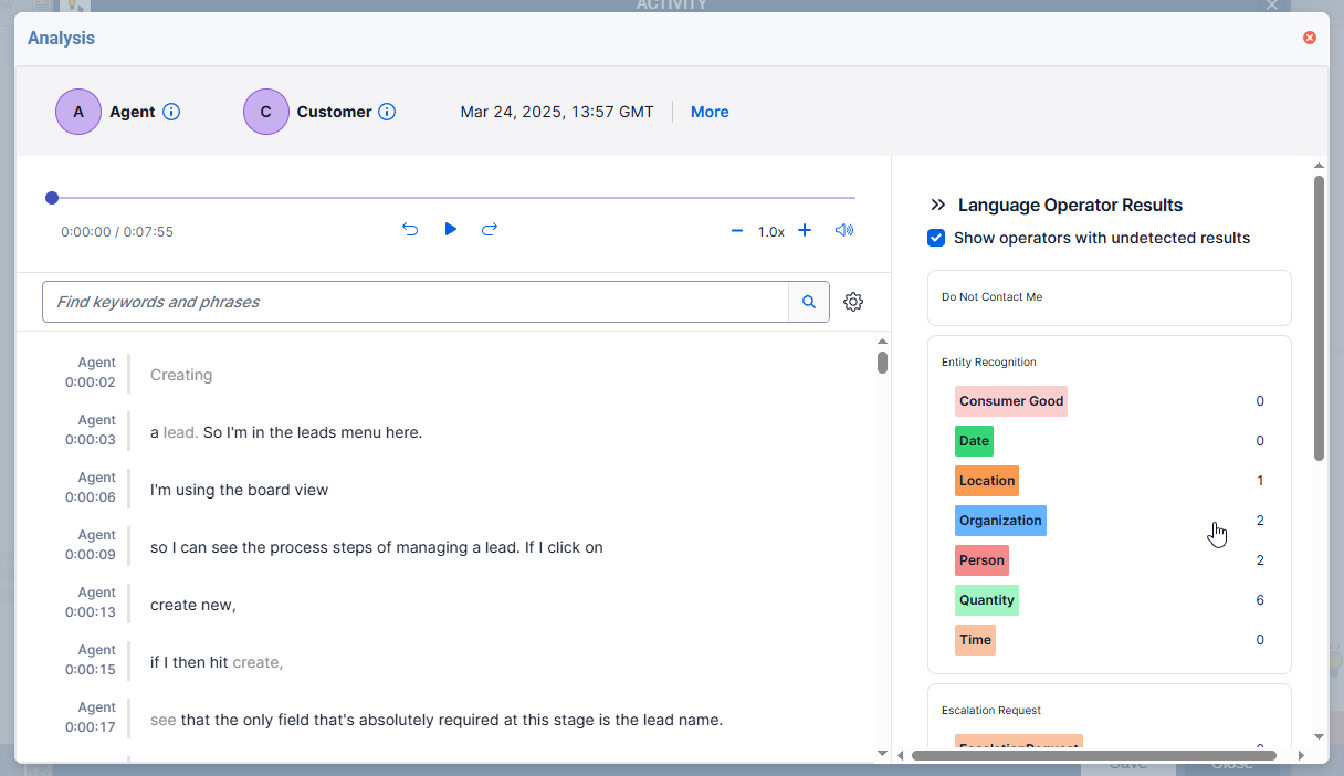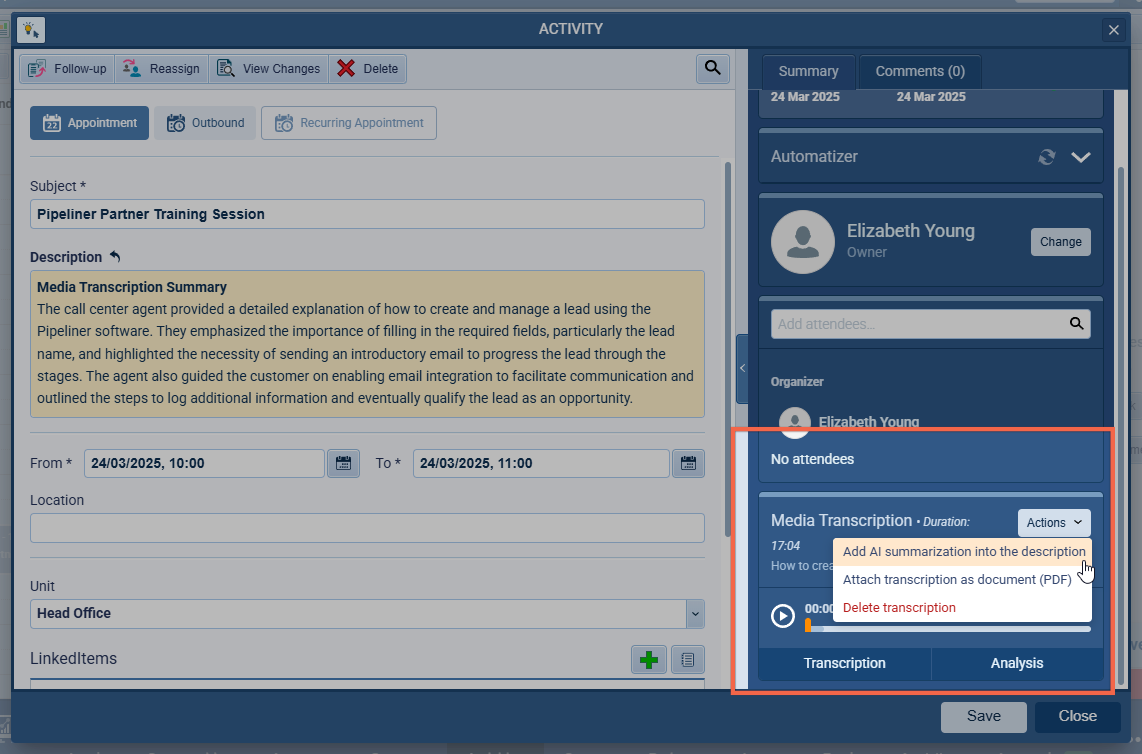 As well as reviewing the “Transcription and Analysis“, the user can listen to the recording or use the Actions dropdown to “Add AI” summarization into the description field of the “Activity“, “Attach” transcription as document (pdf) or “Delete Transcription“.