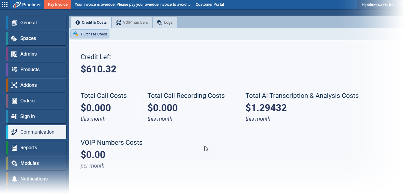 Credits are managed and added from the “Communication” tab in the Subscription main menu. Credits are shared across “Media Transcription“, “Calling & MessagingMessaging Messaging is the process of communicating your brand’s value proposition, the benefits you offer, and the perceived meaning of such communication among your target audience.“.
