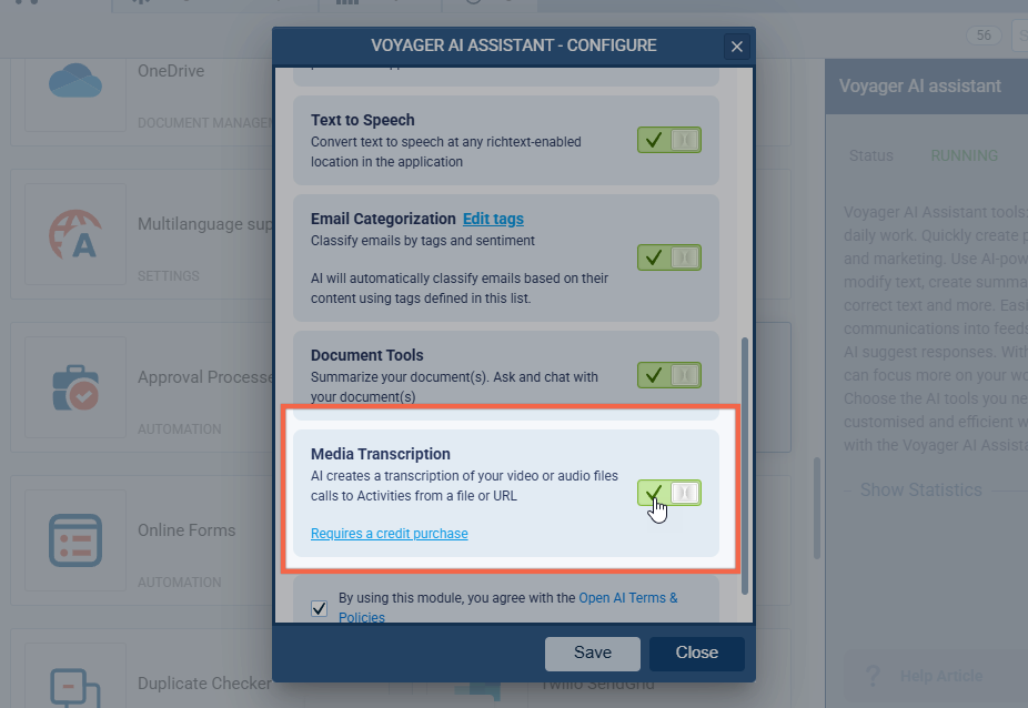 Administrators can enable “Media Transcription” from the “AI Voyager>Configure” option in the Automation Hub.