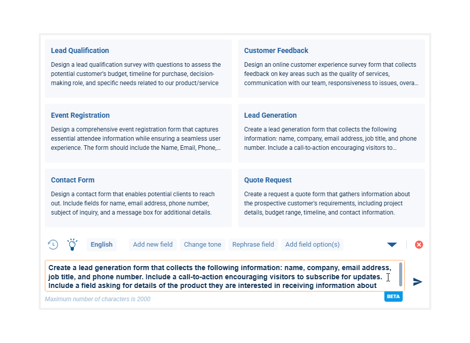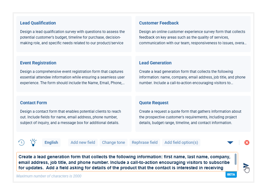 Users can adjust or add to the suggested prompt and then click on the arrow to generate the draft form.