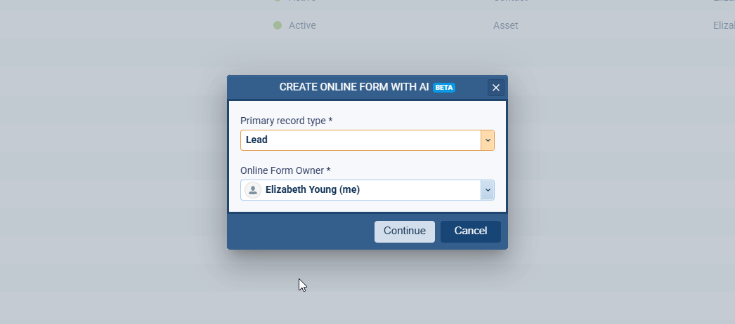 The user will click on the “Create” with “AI Beta” button and then select the main entity that the Online Form should be based on.