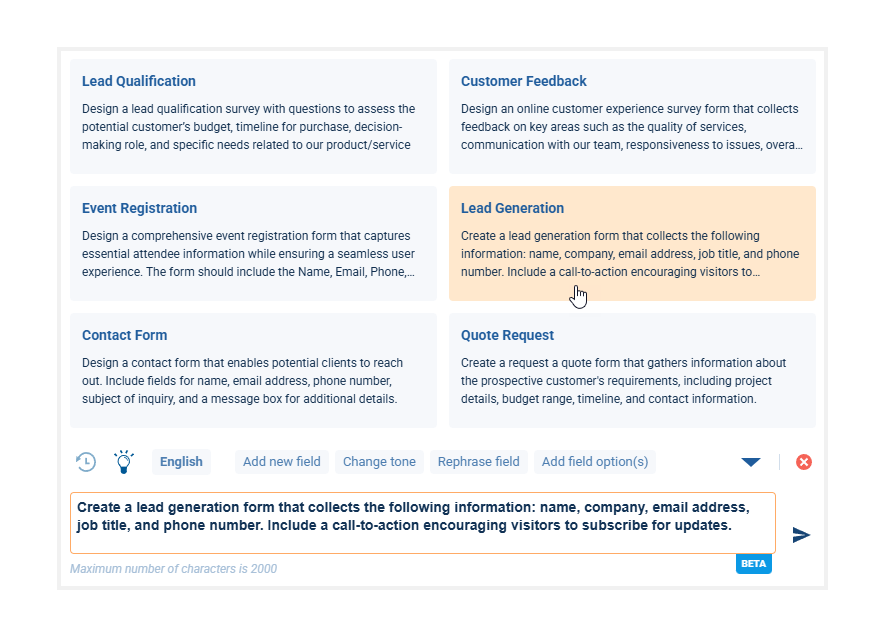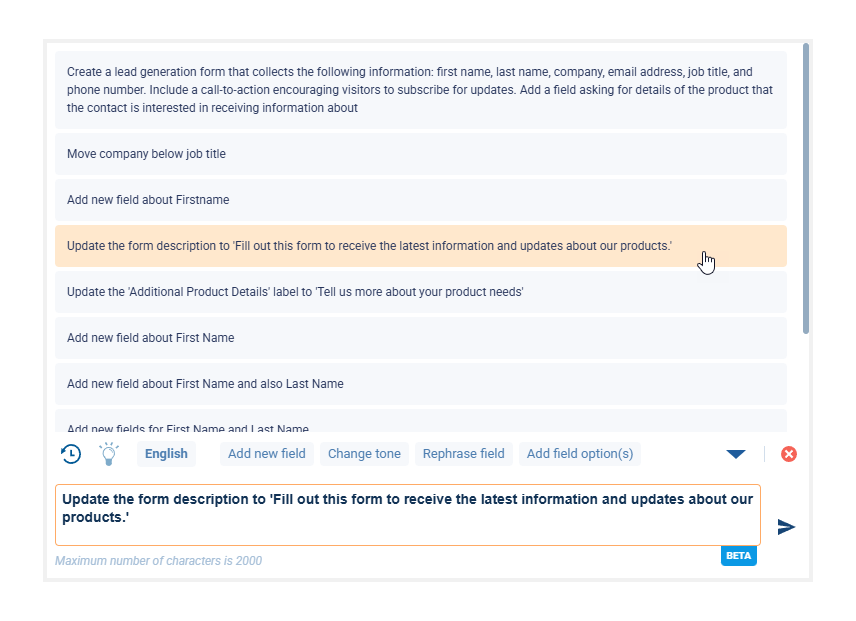 Clicking on the “lightbulb” icon and then opening the panel will display some suggested prompts for different types of Form based on the selected entity and clicking on one of the suggestions will insert suggested text into the AI prompt box.