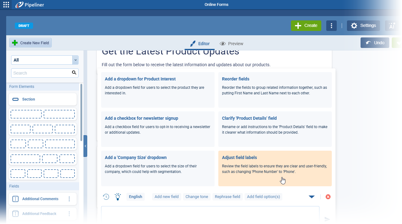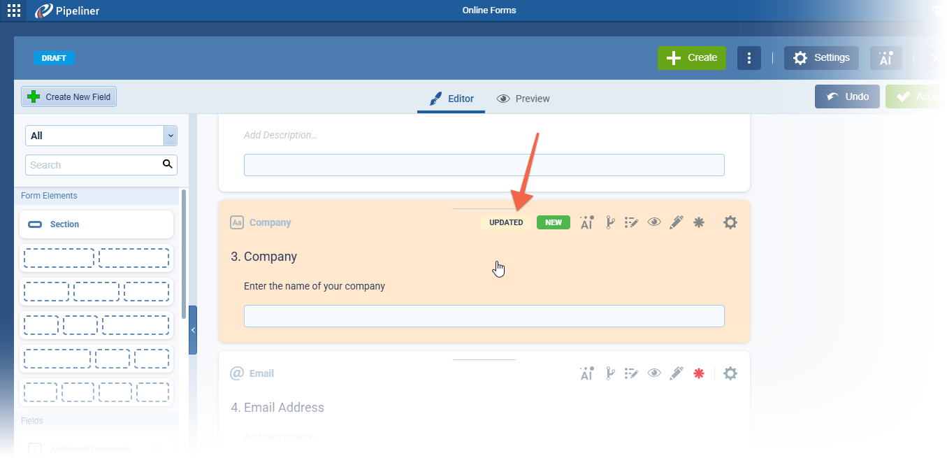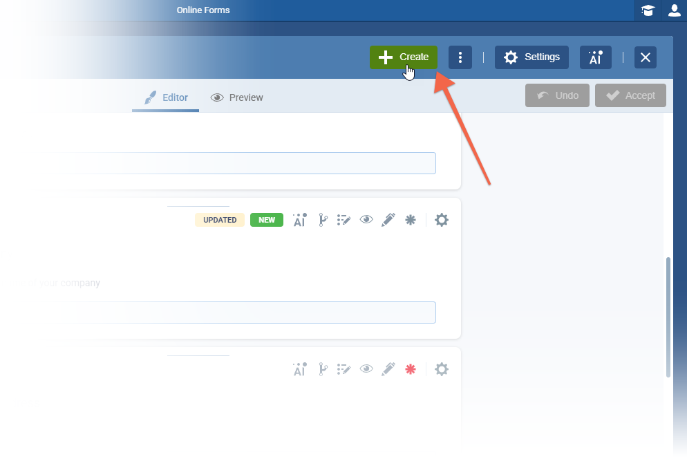 All changes can be applied by clicking “Accept” or reversed by clicking “Undo“. Once the user is happy with the contentContent Content refers to a material or document released in various forms (such as text, image, audio, and video) and created to inform, engage or influence specific audiences. and layout of the Form, they need to click on the “Create” button in order to create the form and can then add the required “Settings” such as record matching.