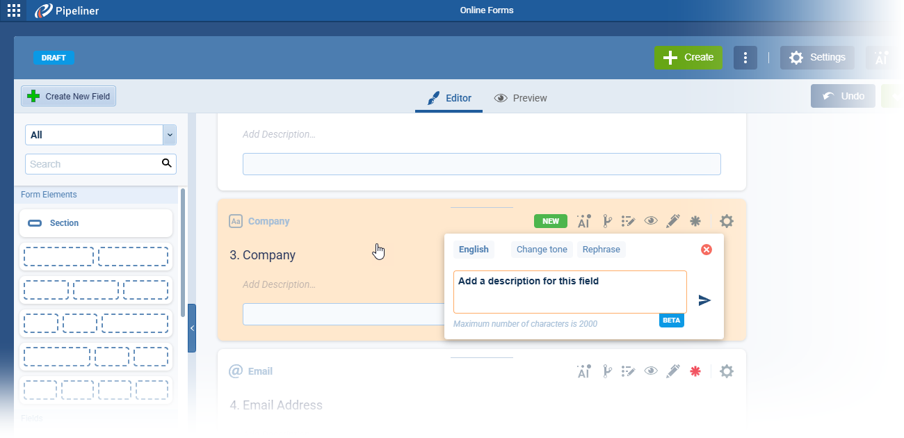 The Voyager AI Online Form Agent is the next huge leap forward in using the power of AI to streamline how users work in Pipeliner. Online Forms is used by the majority of our customers but it can take time to create the form, add each field and to then adjust the layout. Now though, Voyager AI will do the heavy lifting for users who can instruct the agent to create the form using natural language.